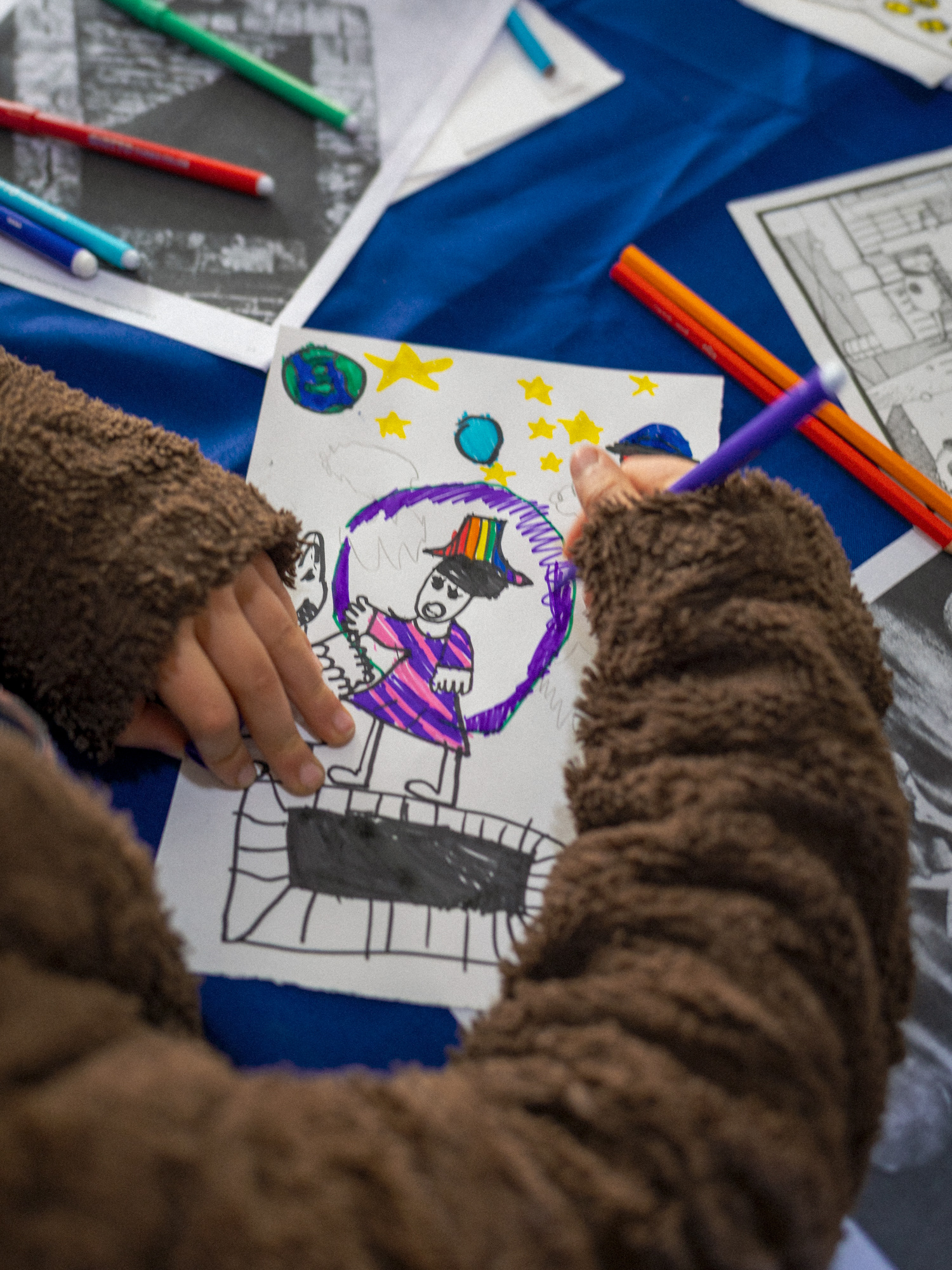 Por la tarde, el taller para infancias "Imágenes contadas" por Mecha Frías, abrió un espacio lúdico y creativo para lxs más chicxs.